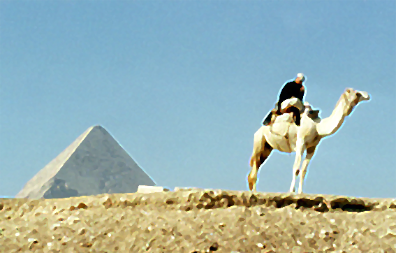 Puis, les pyramides dont la Pyramide de Mykérinos en granite. Etant collectionneur de pierre, je voulais récupérer un petit caillou de la pyramide dans les décombres. Avec une grosse pierre, j’essayais d’en casser une autre pour en prendre un petit bout. Je me baisse à l’abri des regards, commence ma besogne et au même moment j’entends siffler. Je me redresse, regarde attentivement autour moi, rien. Je recommence et de nouveau j’entends quelqu’un siffler. Je me relève, rien. Je me dépêche de casser mon caillou, malgré les sifflements.