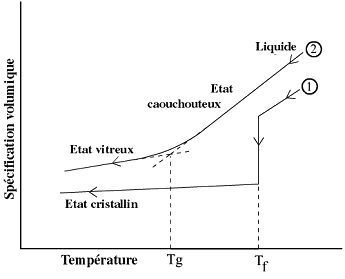 Pour devenir plus quantitatifs au sujet de la caractérisation du phénomène et du Tg de transition vitreuse, nous notons qu'en refroidissant un matériel amorphe de l'état liquide, il n'y a aucun changement brusque de volume comme se produit dans le cas du refroidissement d'un matériel cristallin par son point de congélation, Tf . Au lieu de cela, à la température de transition de vitreuse, Tg , il y a un changement de la pente de la courbe du volume spécifique contre. la température, se déplaçant d'une valeur basse dans l'état vitreux à une valeur plus élevée dans l'état caoutchouteux sur une gamme de températures. Cette comparaison entre un matériel cristallin (1) et un matériel amorphe (2) est illustrée dans la figure ci-dessus. Notez que les intersections des deux segments de ligne droite de la courbe (2) définit la quantité Tg . |